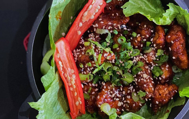 Tender chicken pieces tossed in a fiery chili-garlic sauce, balanced with sweet soy and nutty sesame—this dish delivers a punch of flavour with every bite. Finished with toasted sesame seeds and spring onions, it’s perfect over rice or noodles for a satisfying kick.